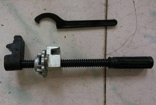 一種由鉤板、絲桿、活動鉗口、防護(hù)罩、螺母、套筒扳手、膠木球、手把、凸塊、螺栓和墊圈組成的鐵路線路加鎖道岔用鉤鎖器,如圖1所示。絲桿插進(jìn)鉤扳上部孔中并焊接?;顒鱼Q口與防護(hù)罩焊接。絲桿穿過活動鉗口和防護(hù)罩。墊圈在活動鉗口上部。螺母在絲桿上,并位于防護(hù)罩內(nèi)。套筒扳手在絲桿上。手把穿過套筒扳手上部通孔。防護(hù)罩側(cè)面通孔上焊有凸臺、凸臺上有螺栓。本實(shí)用新型自鎖閉性能好,加鎖或開啟省時,適合鐵路線路加鎖道岔。