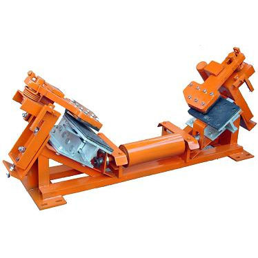 DDZ-30/80、100、1200、1400型帶式輸送機(jī)用斷帶抓捕器沿帶式輸送機(jī)多處安裝,當(dāng)皮帶正常運(yùn)行時(shí),中部的單向輥輪隨皮帶轉(zhuǎn)動(dòng),左右兩楔形閘塊處于皮帶下方且與皮帶不接觸,上閘塊調(diào)整到皮帶兩側(cè),且與皮帶縱向平行。當(dāng)發(fā)生斷帶時(shí),觸動(dòng)裝置使上閘塊快速轉(zhuǎn)動(dòng)到皮帶上方,同時(shí)帶動(dòng)楔形閘塊繼續(xù)沿楔形槽運(yùn)動(dòng),將下滑的皮帶夾持制動(dòng)在上閘塊與楔形閘塊之間,阻止斷帶下滑。