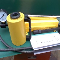 2、使用前裝上壓桿,旋緊手輪,旋開排氣閥,然后撳動(dòng)壓桿,使液壓油通過高壓膠管輪入空心油缸內(nèi)。使油缸上升10MM左右,然后旋松手輪,使油缸復(fù)位,反復(fù)數(shù)次,使缸內(nèi)空氣排完。